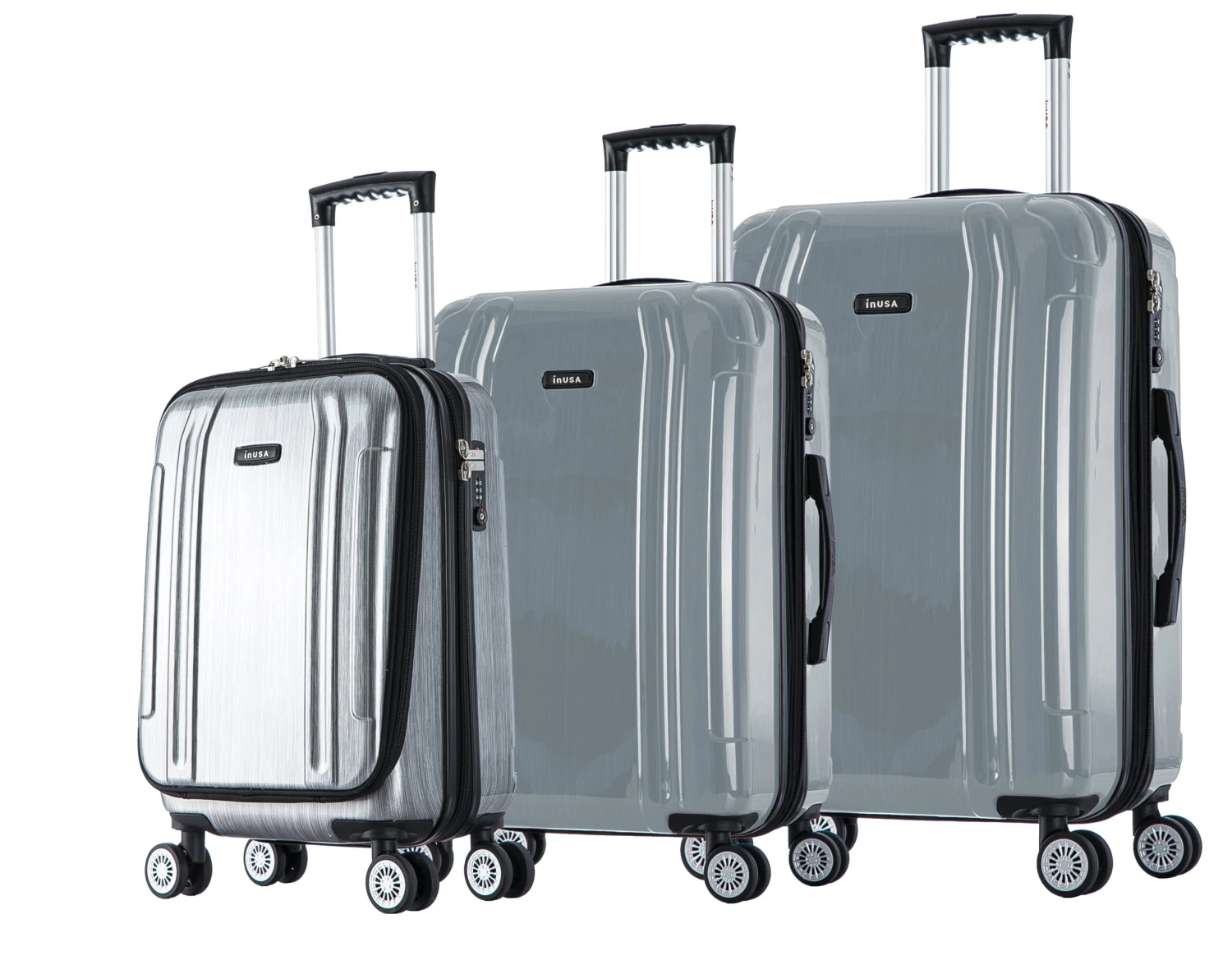 The InUSA SouthWorld collection is proudly assembled in the USA from imported parts using lightweight ABS and PC printed Film engineered material with brushed metallic or carbon finish. The sturdy construction offers maximum strength, durability and a water/scratch resistant finish. Functional style with 4 airplane design dual spinner multi-directional silent 360 degree wheels for effortless mobility. Full interior fabric lining with a zippered compartment on one side, opposite side offers tie-down straps for additional support and two inside pockets. Built-in 3 digit TSA approved combination lock, push button locking internal retractable aluminum trolley system. The carry-on includes a convenient easy-access front pocket with integrated padded sleeve which can accommodate a 15 laptop , store your passport and other travel accessories, it also offers a Top ergonomic GEL handle. Smooth gliding oversized number 10 tamper proof Zipper.