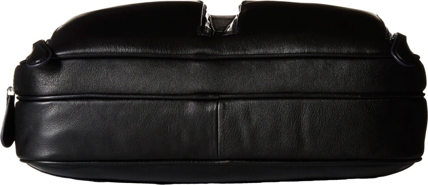 Zipper closure. Dual rolled carrying handles with detachable, adjustablecrossbody strap. Three exterior zip pockets. Signature logo embossed detail infront. Flat bottom. Lining made of polyester. Interior zip pocket. Threeinterior multifunctional slip pockets.