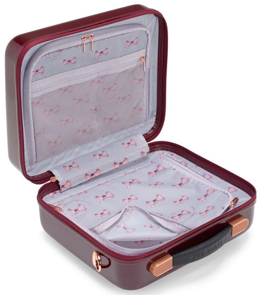 Color:Burgundy Porcelian Rose The Take Flight Porcelain Rose Vanity from TedBaker is a beautiful, lightweight cosmetic case with flowery front print forfun traveling. Interior features Ted Baker signature print and organized foroptimal packing.