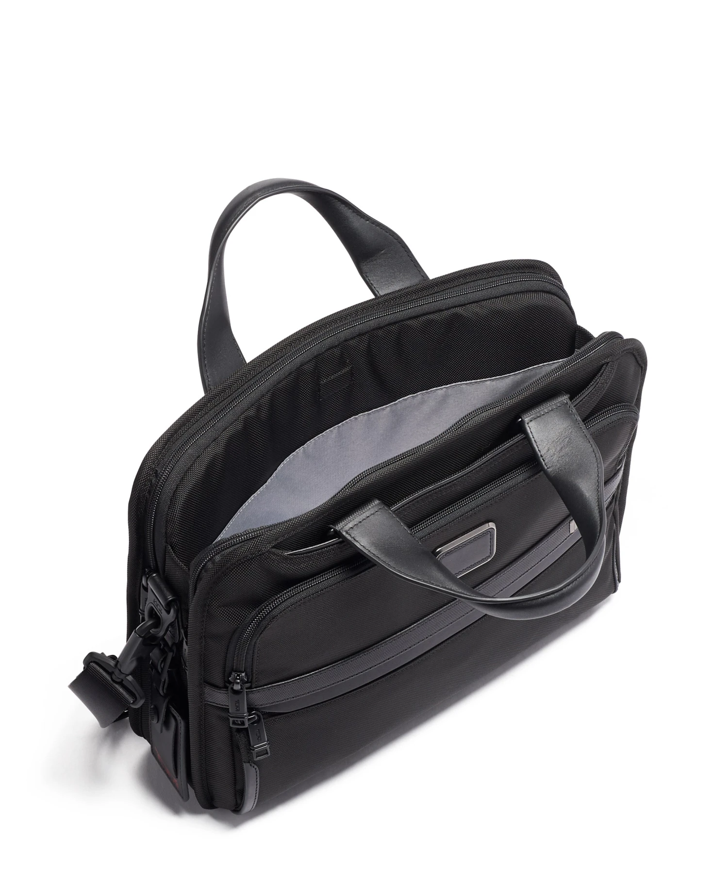 Padded tablet pocket, Zip pocket, 6 media pockets, Open pocket, 3 card pockets, Pen loops, Key leash, TUMI Tracer