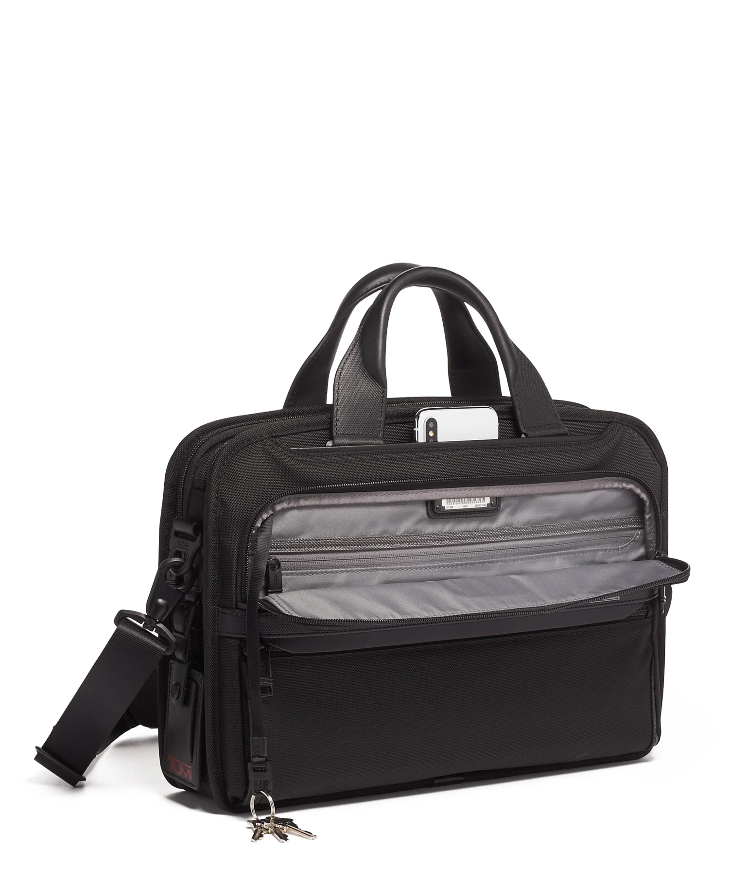 - Padded tablet pocket, Zip pocket, 6 media pockets, Open pocket, 3 card pockets, Pen loops, Key leash, TUMI Tracer